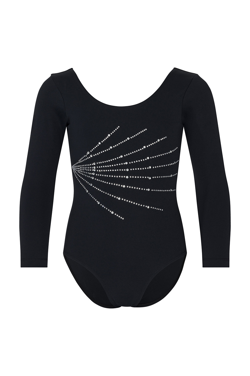 Dieser Langarm Gymnastikanzug überzeugt durch einen klaren, sportlichen Look und feine, glitzernde Details. Auf der Vorderseite sorgen dezente Strass-Applikationen in Strahlenform für einen eleganten Akzent, der besonders bei Gymnastik und Rhythmischer Sportgymnastik gut zur Geltung kommt.